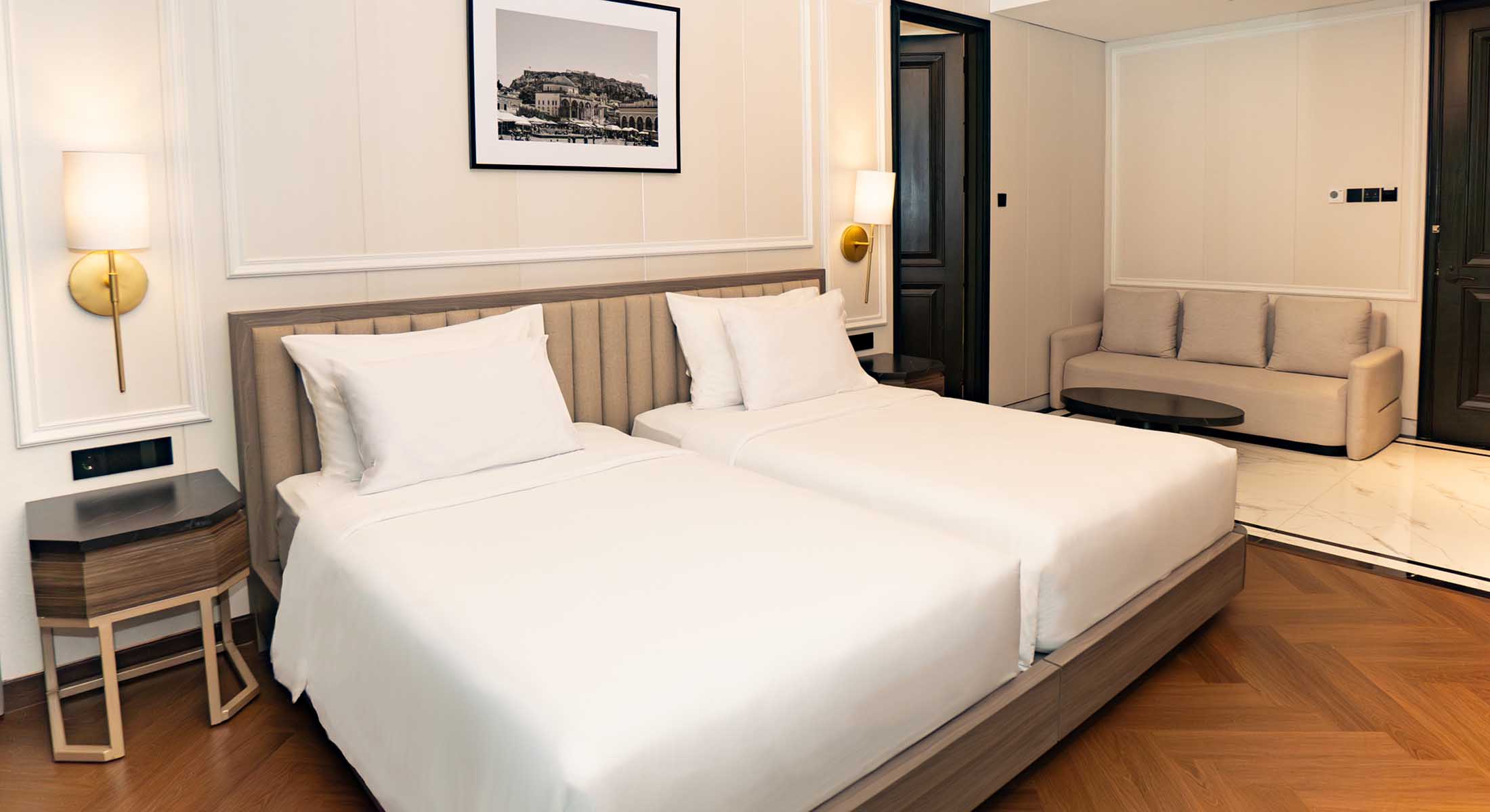 Experience ultimate comfort in our Executive Twin with Balcony, a perfect choice for guests seeking more space and premium amenities. This room is furnished with two twin beds, each measuring 120 cm x 200 cm, offering a restful sleep environment for two people. With a spacious area of 51 square meters, the room provides ample space for relaxation and work.