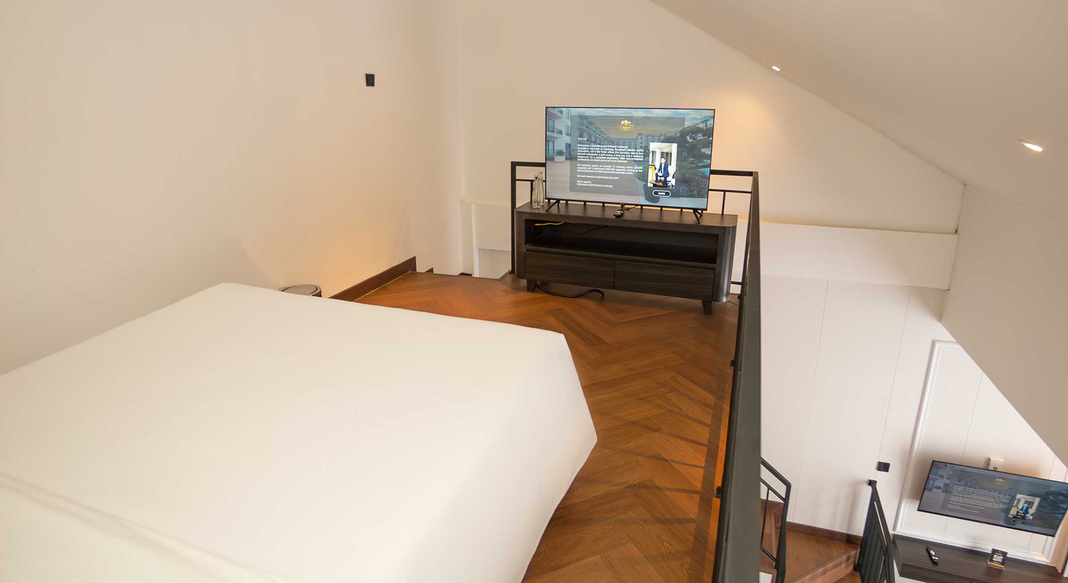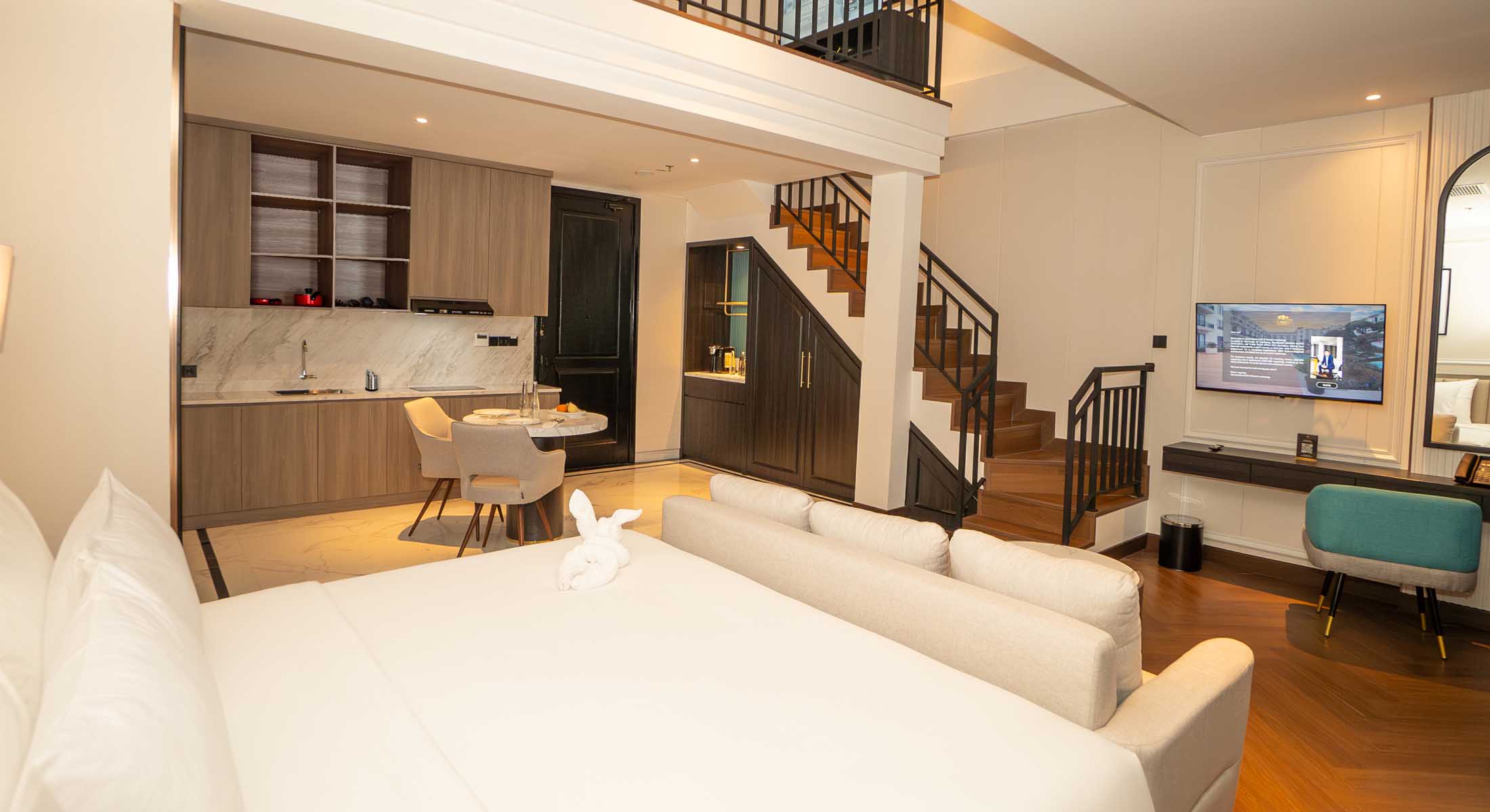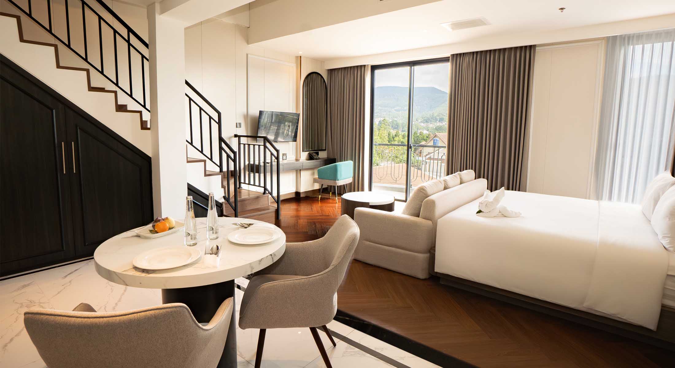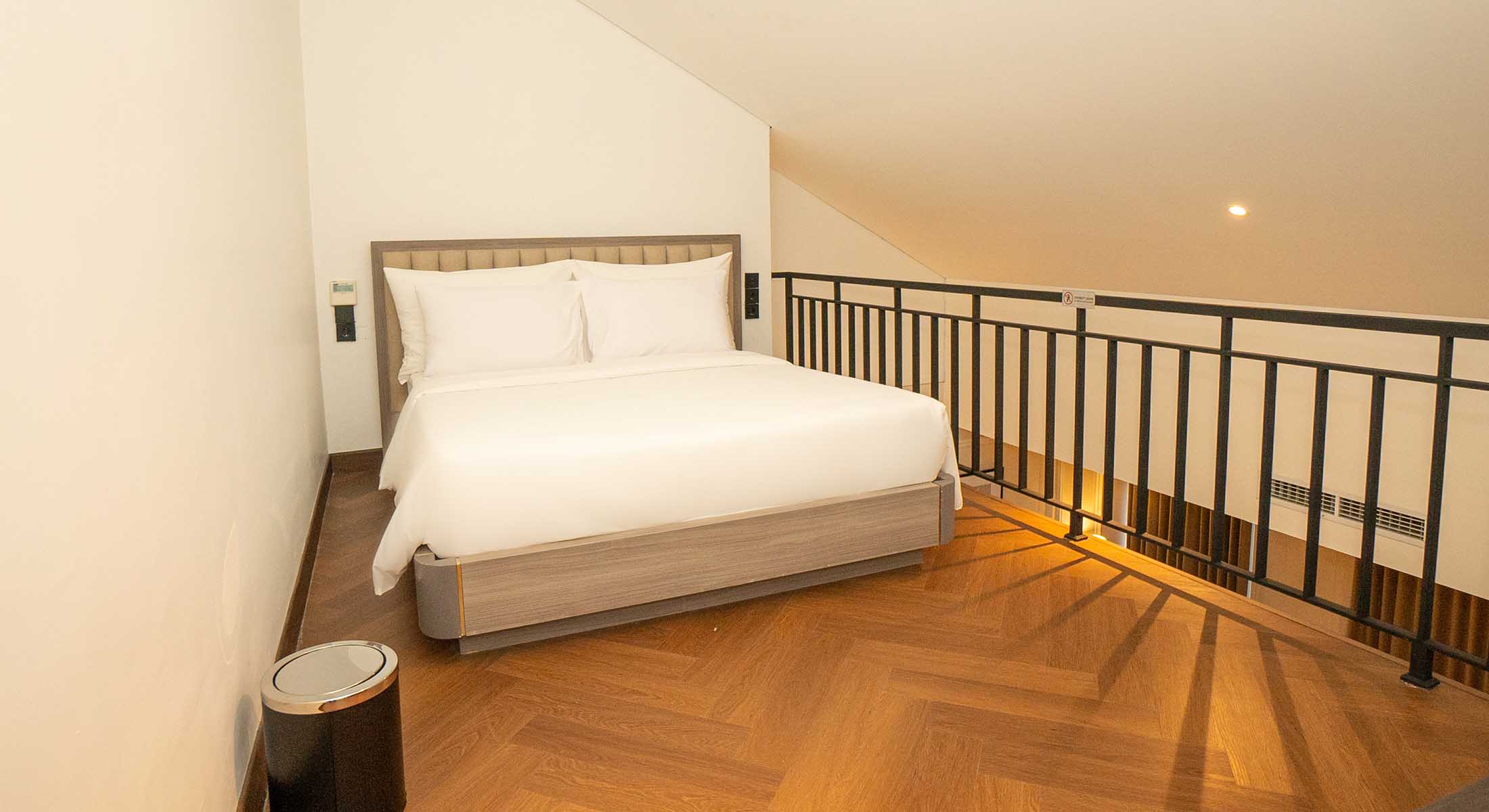 Experience exceptional comfort in our Mezzanine Suite with Balcony and Pool View — a stylish two-level suite perfect for families or small groups. Spanning 85 square meters, this spacious suite features a king-sized bed (200 cm x 200 cm) on the lower level and a queen-sized bed (180 cm x 200 cm) on the mezzanine level, offering both comfort and privacy for up to four guests. Step out onto the private balcony and enjoy calming views of the pool — an ideal setting to relax and recharge.