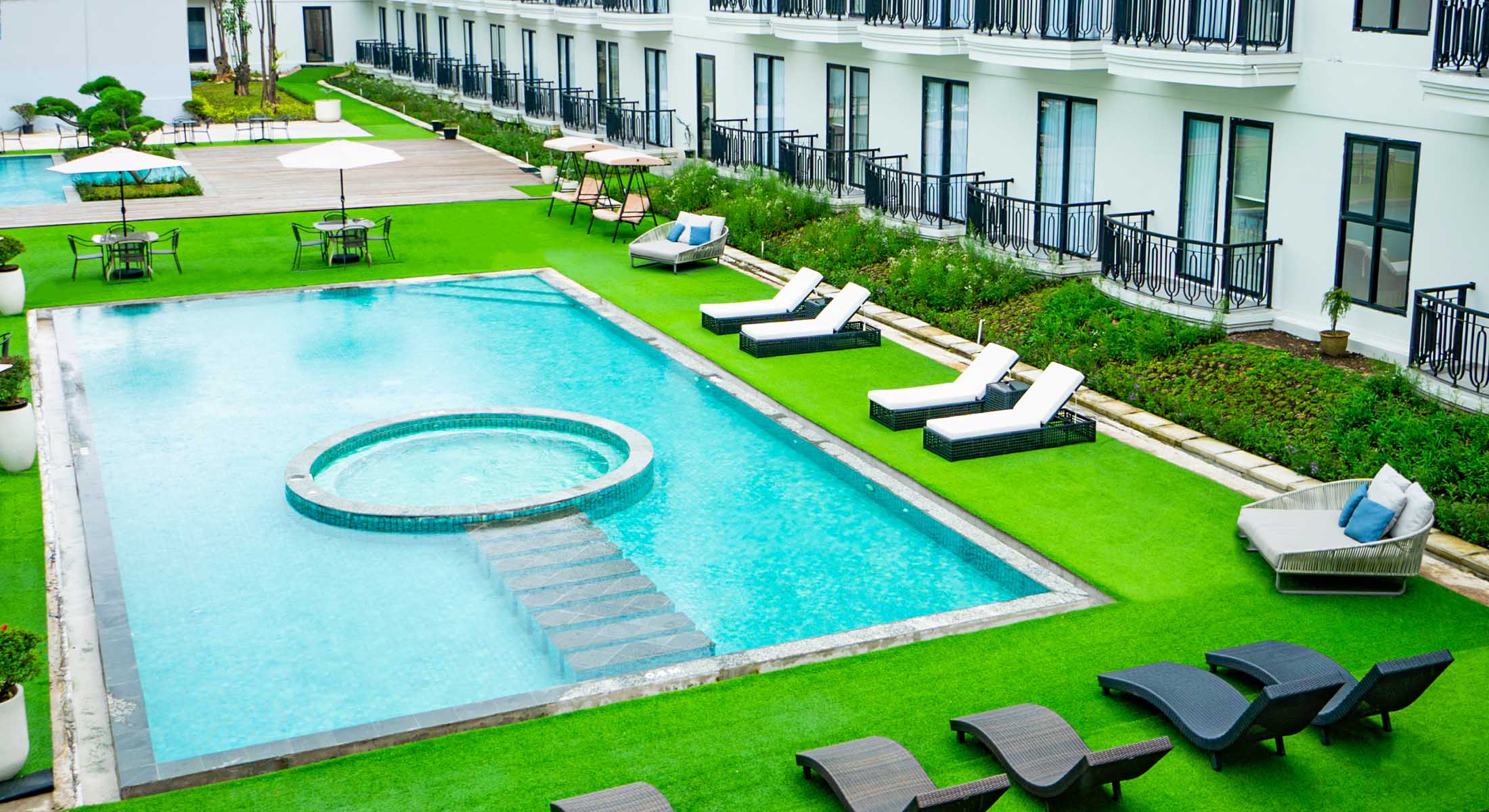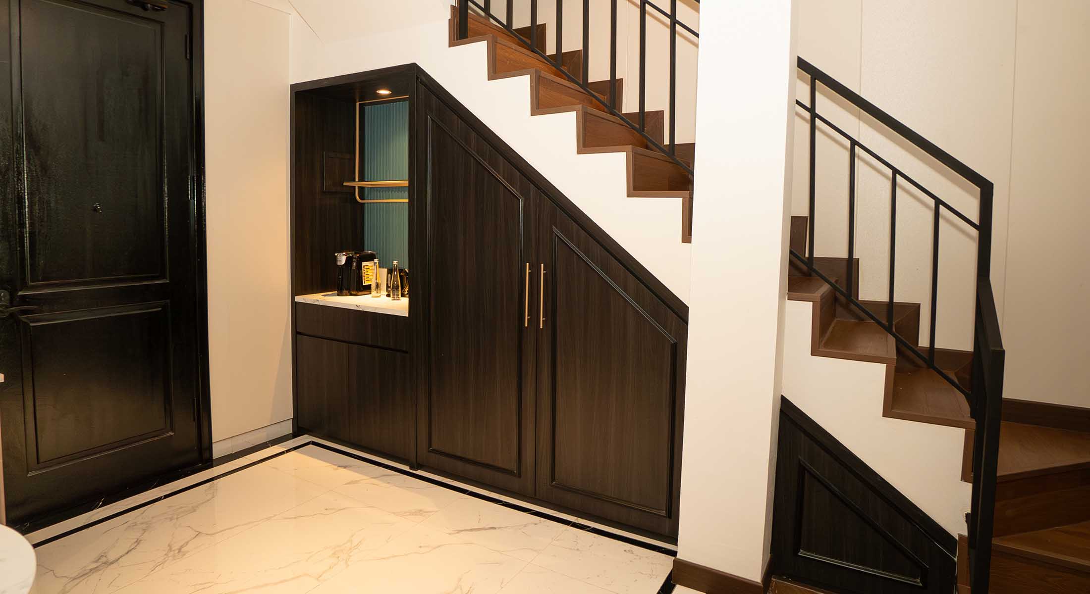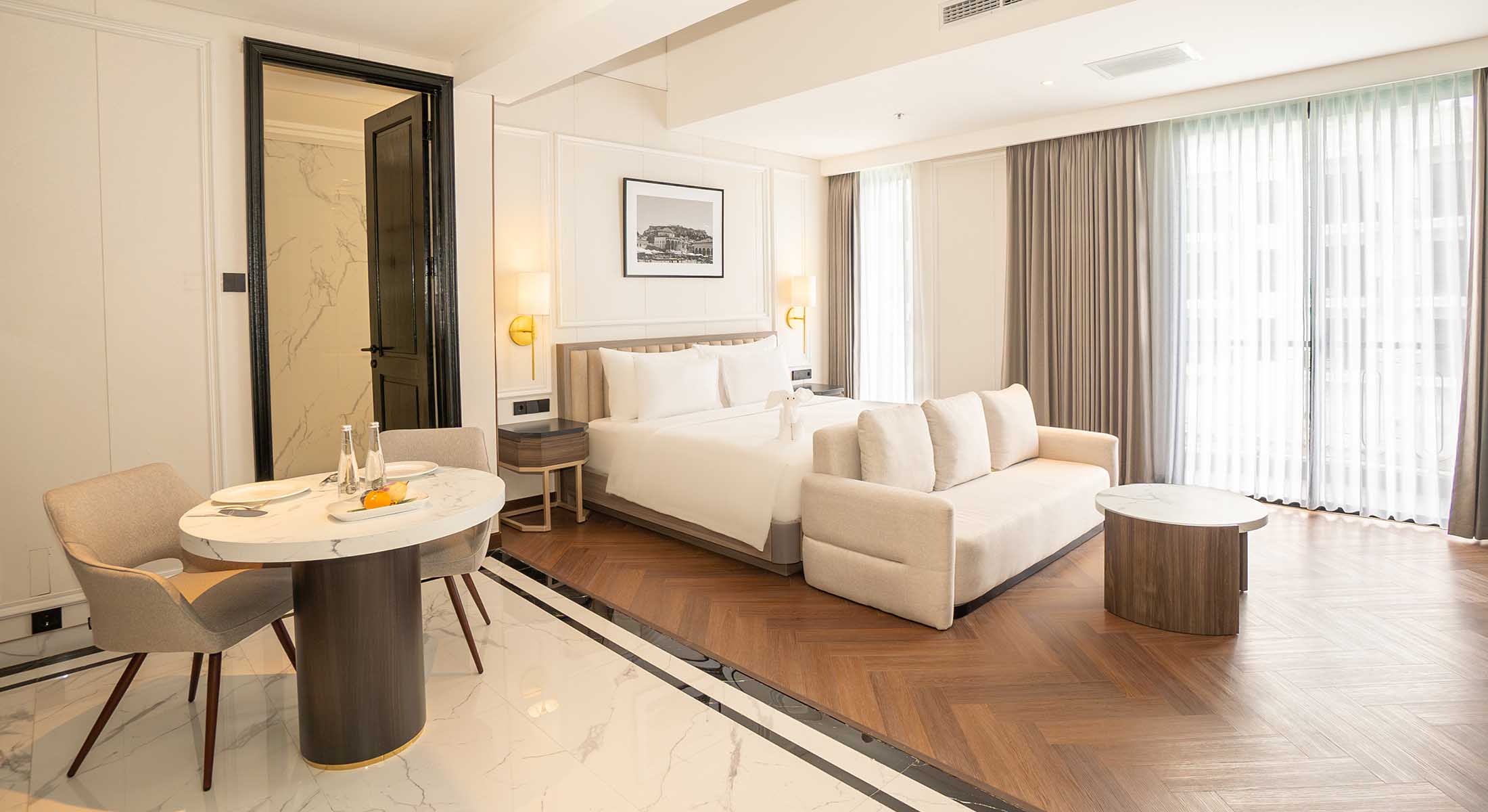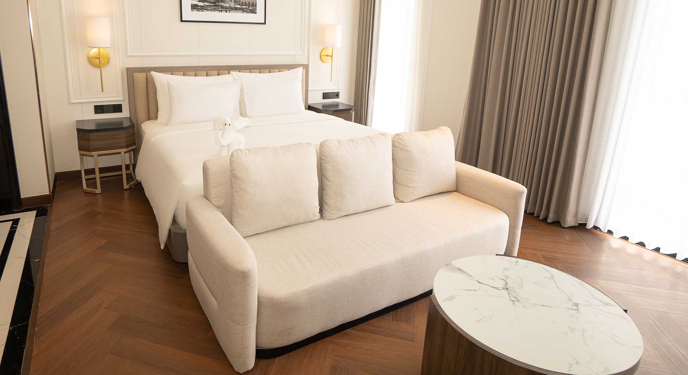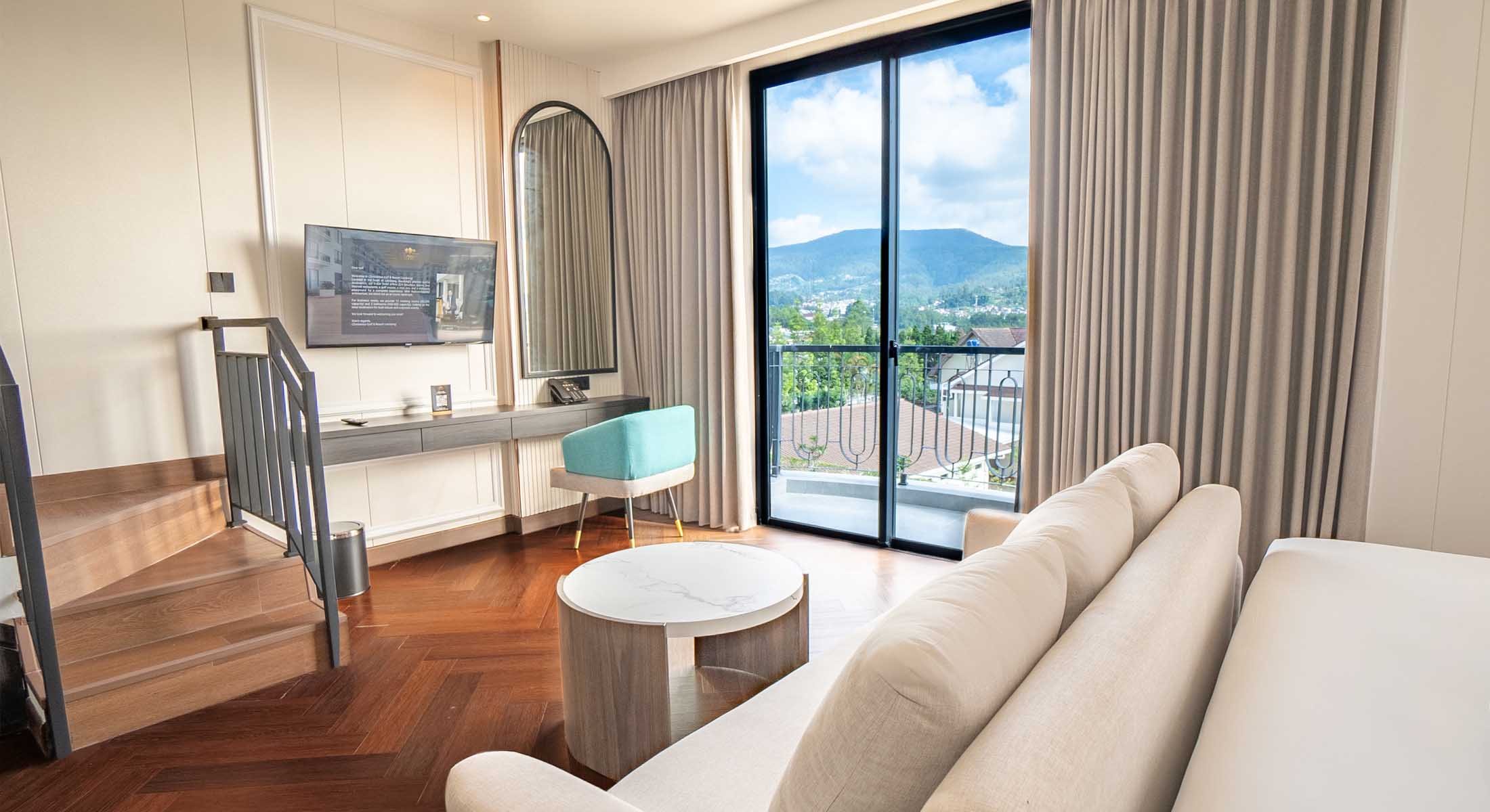Experience exceptional comfort in our Mezzanine Suite with Balcony and Pool View — a stylish two-level suite perfect for families or small groups. Spanning 85 square meters, this spacious suite features a king-sized bed (200 cm x 200 cm) on the lower level and a queen-sized bed (180 cm x 200 cm) on the mezzanine level, offering both comfort and privacy for up to four guests. Step out onto the private balcony and enjoy calming views of the pool — an ideal setting to relax and recharge.